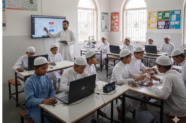 Modern education from Nursery to Class 12. Early years follow advanced textbooks like English medium schools with experienced teachers, making subjects engaging. Classes 5-12 use the Madrasa Board curriculum covering Mathematics, Science, Social Studies, and Languages. We give equal importance to academic excellence alongside Islamic studies, preparing students for higher education and successful futures.